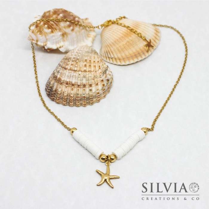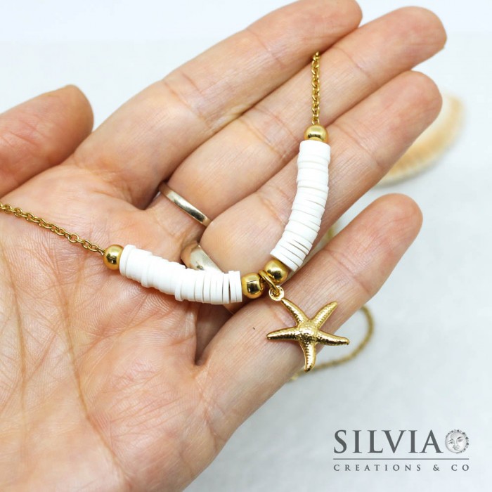 Collana girocollo catena con perline heishi bianche e stella marina oro
