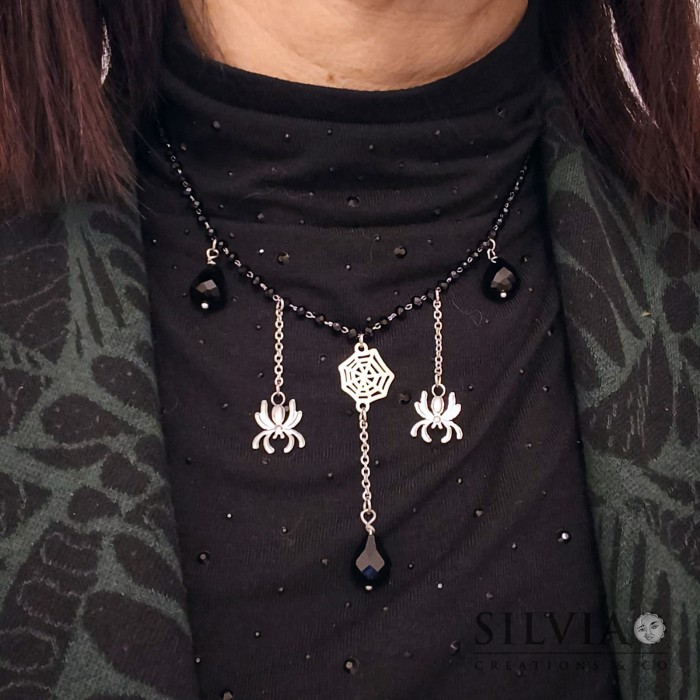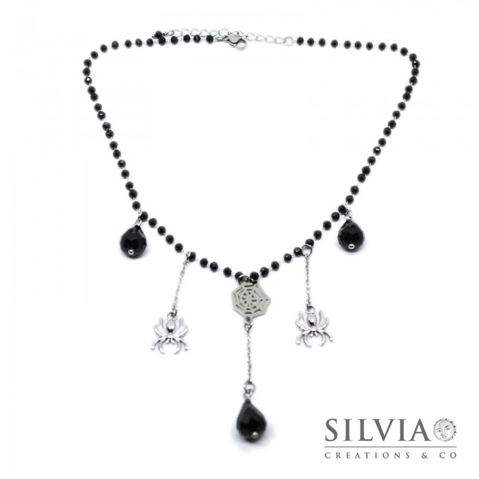 Collana girocollo cristalli neri con ragnatela ragni e gocce