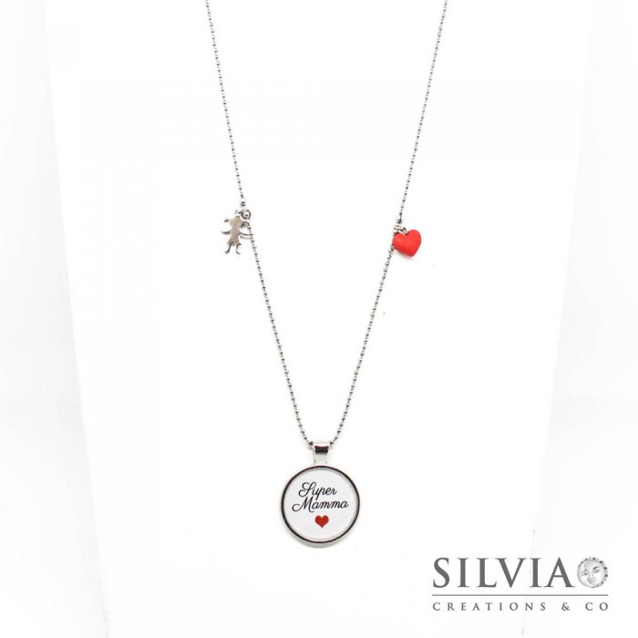 Collana lunga catena acciaio con frase "Super Mamma" cuore rosso e bambino
