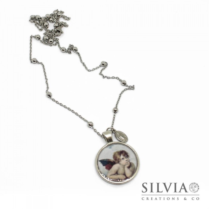 Collana lunga catena acciaio e ciondolo con angelo di Raffaello
