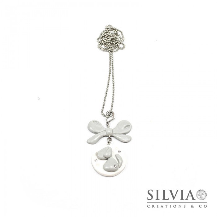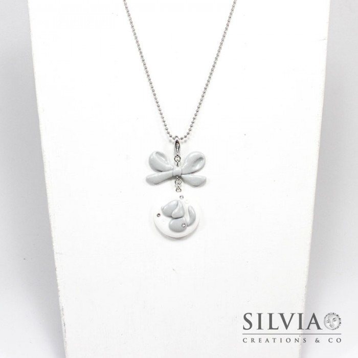 fiocco da 38x25 mm color grigio. L'altro ciondolo è un disco bianco da 30x30 mm