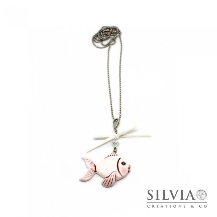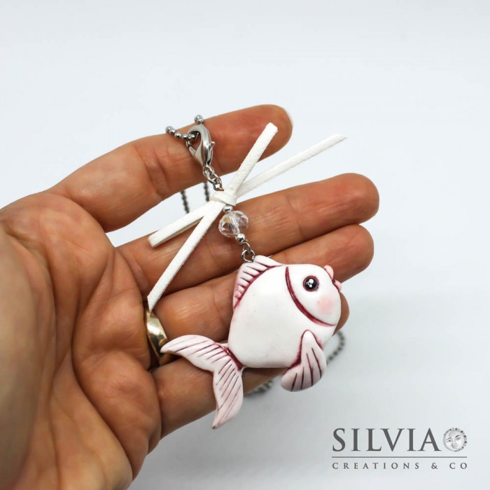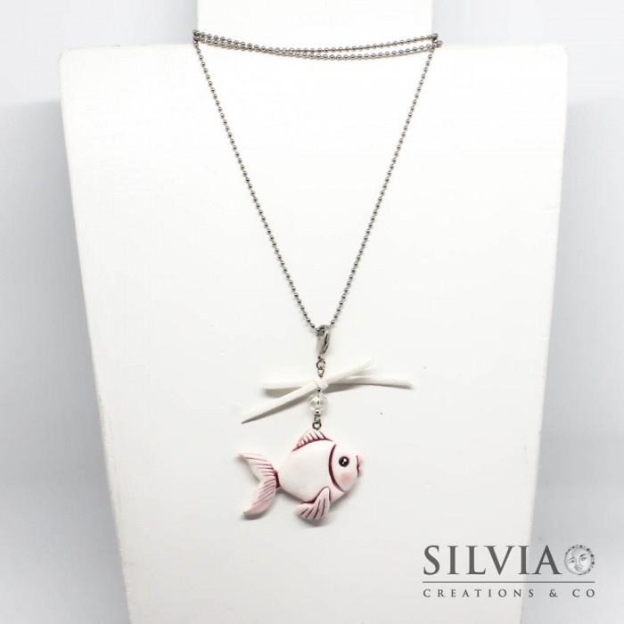 Collana lunga pesce bianco e rosa con fiocco