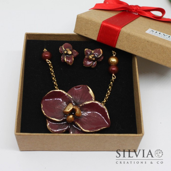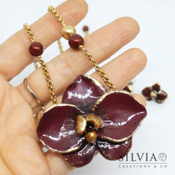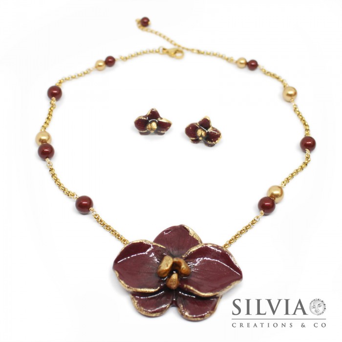Collana girocollo e orecchini a lobo con orchidea bordeaux e oro
