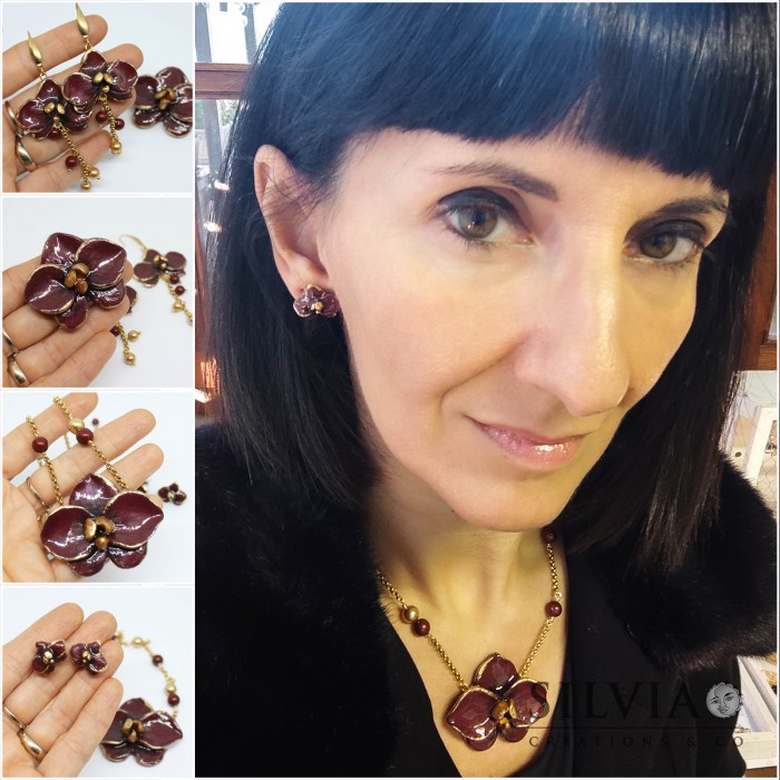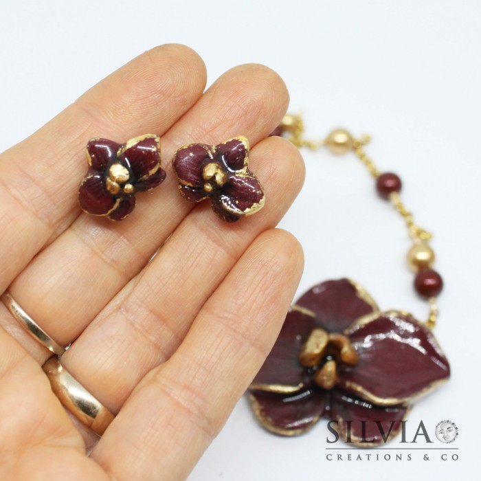Orecchini pendenti e spilla con orchidea bordeaux e oro