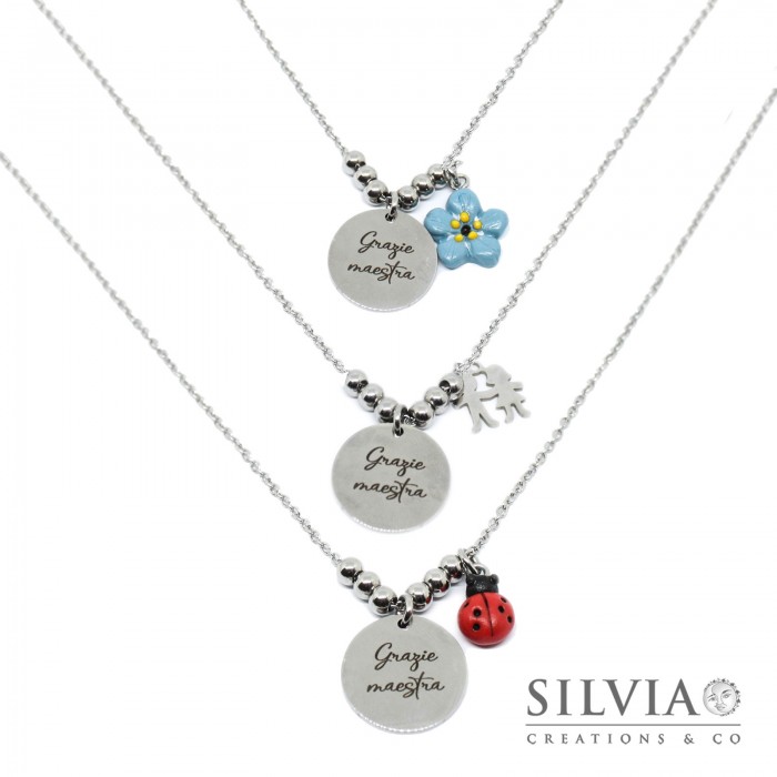 Ho realizzato questa collana con una catenina forzatina in acciaio e un ciondolo in acciaio tondo da 2 cm con inciso Grazie maestra. Potrete scegliere se incidere anche il retro del ciondolo indicando il nome della maestra o la classe e l'anno scolastico