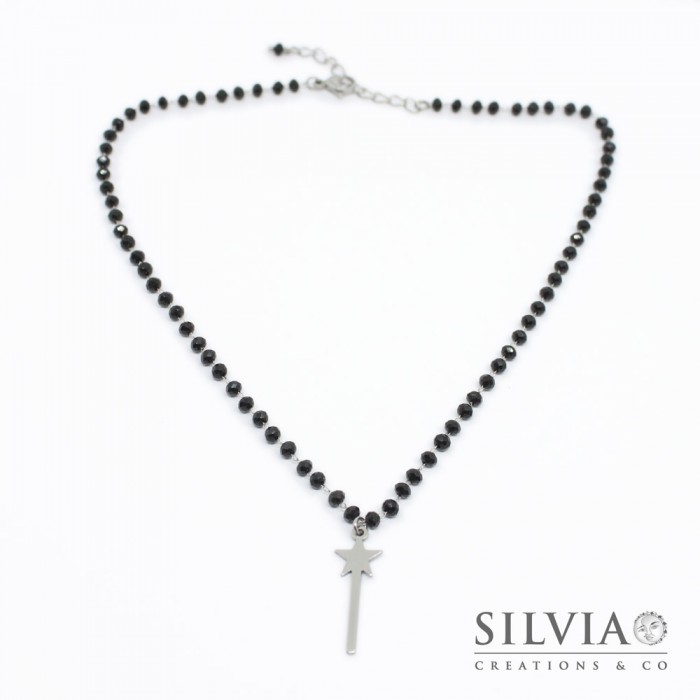 Collana girocollo catena acciaio con cristalli neri e ciondolo bacchetta magica