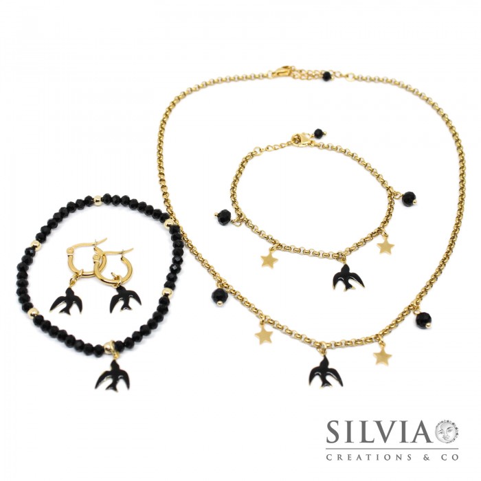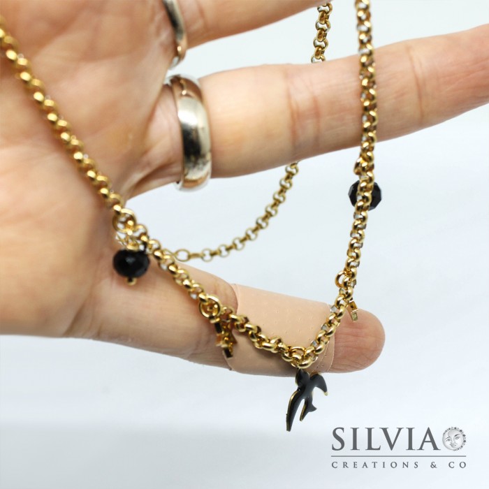Collana girocollo con ciondolo rondine nera stelle e cristalli