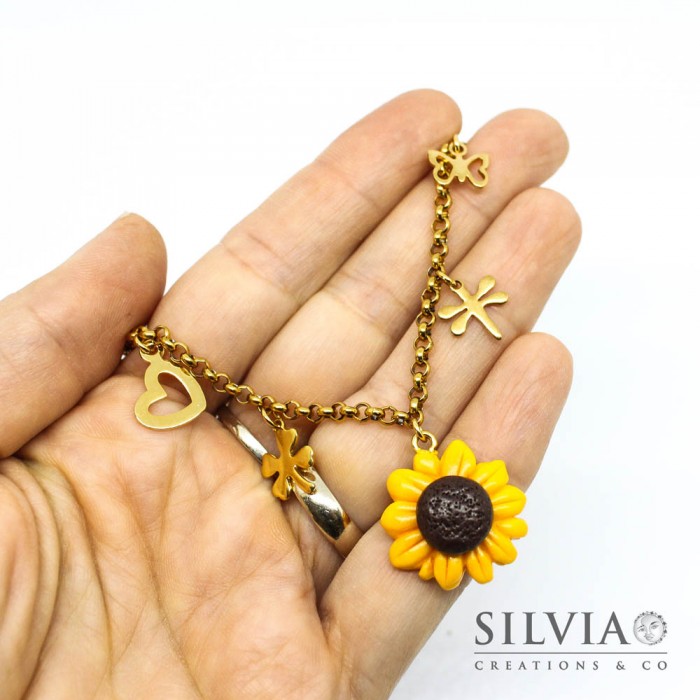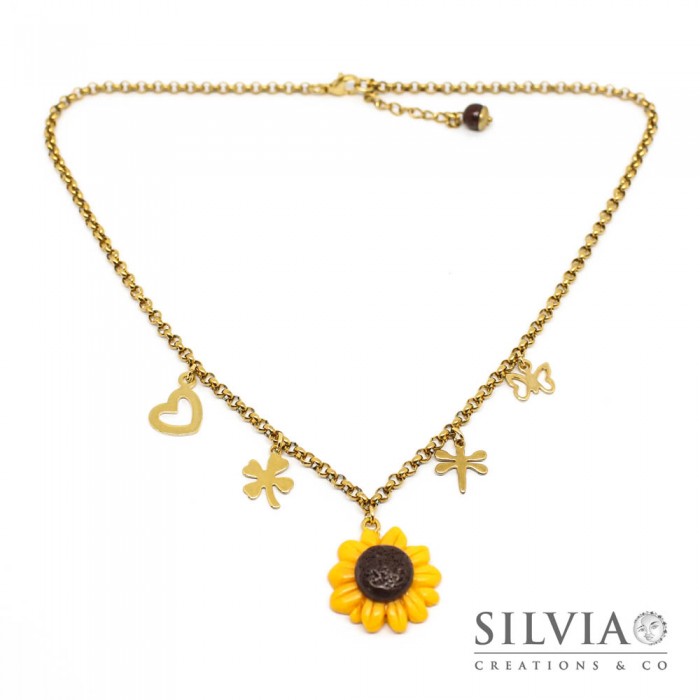 Questo soggetto è fissato ad una catena rolo in acciaio color oro. Oltre al girasole alla catenina ho agganciato dei piccoli charms in acciaio dorato: un cuore, un quadrifoglio, una libellula e una farfalla.
