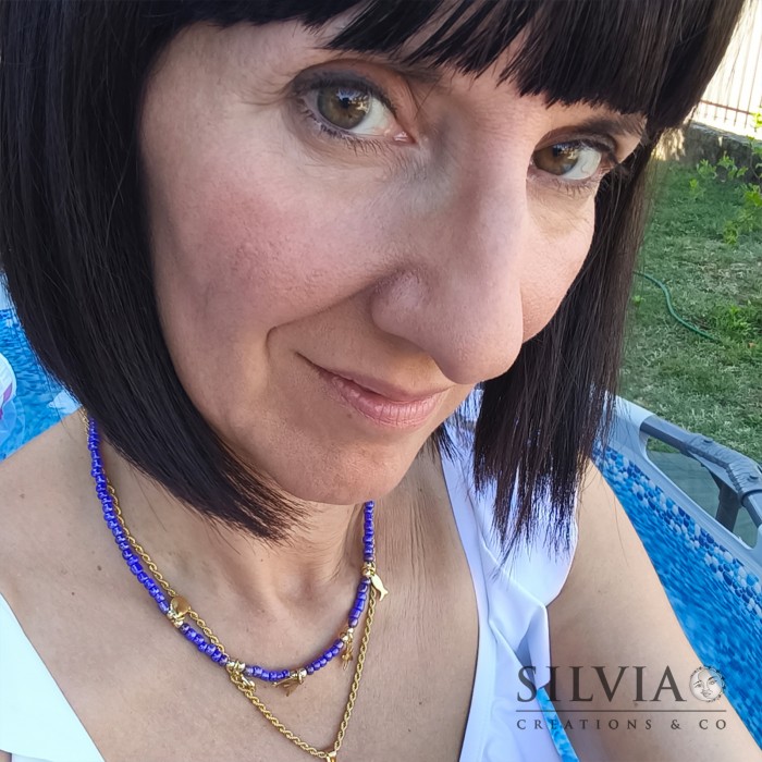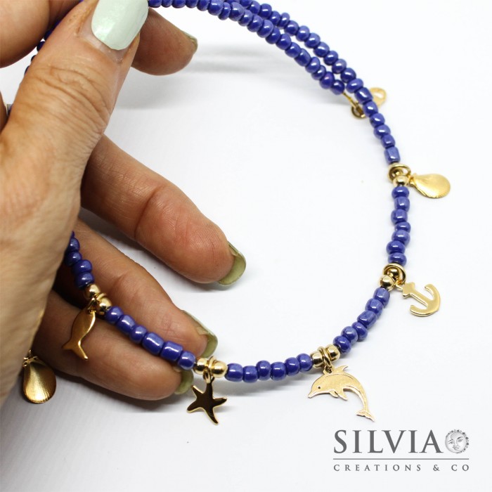 Collana girocollo corallini blu lucido e cinque mini charms mare oro