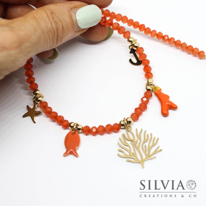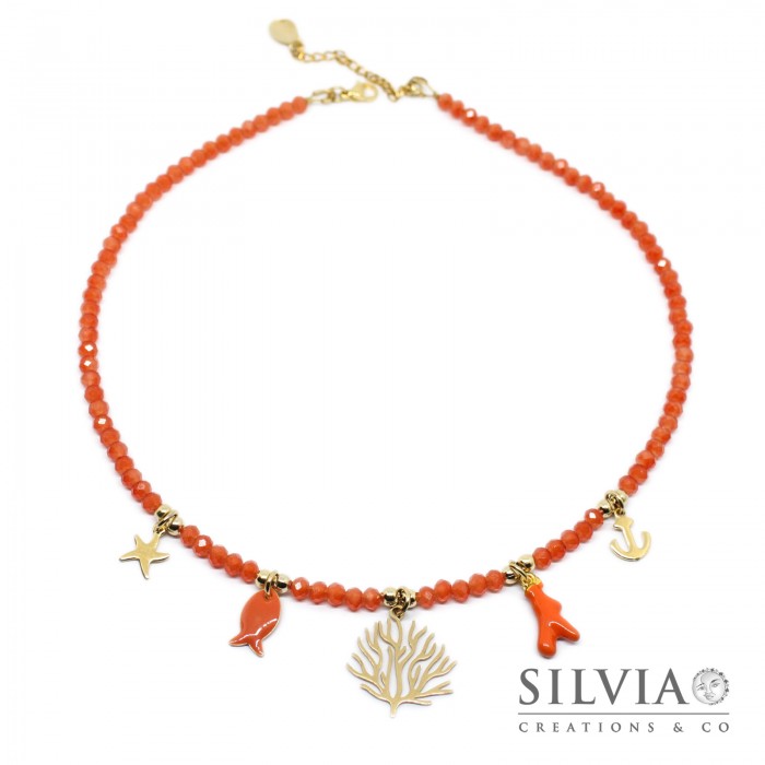 Collana girocollo cristallini arancio rametto di corallo oro e charms mare