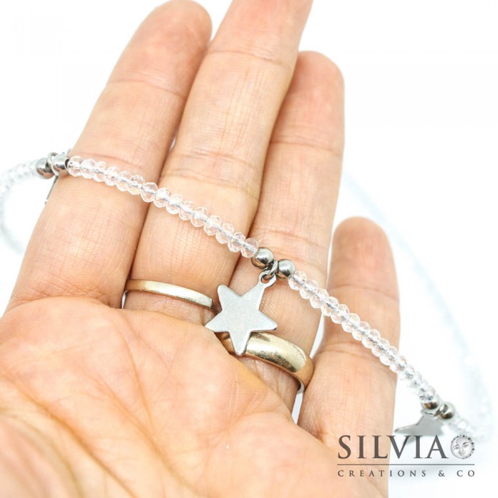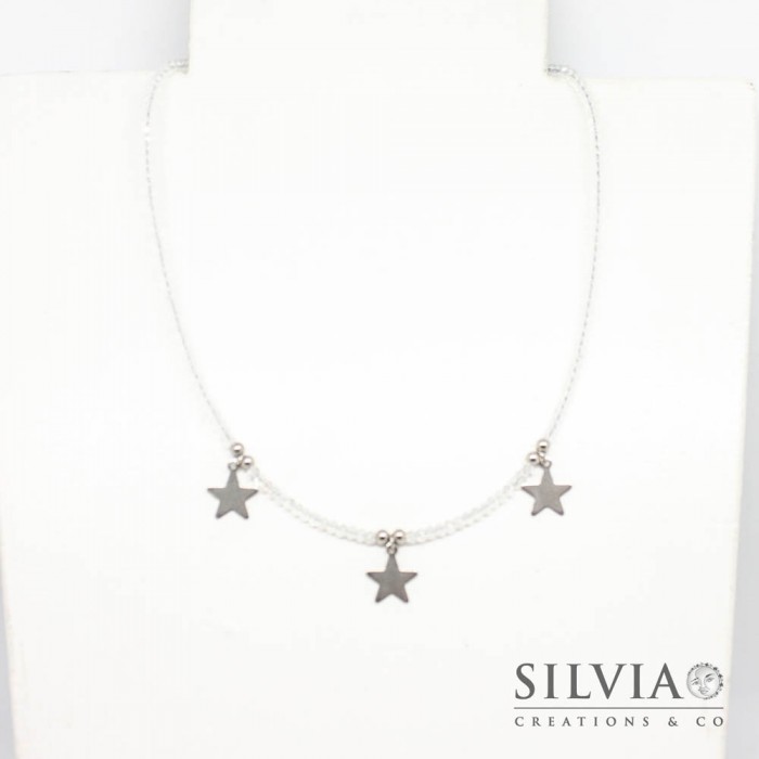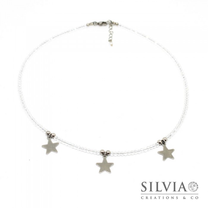 Collana girocollo con cristalli trasparenti e tre stelle in acciaio