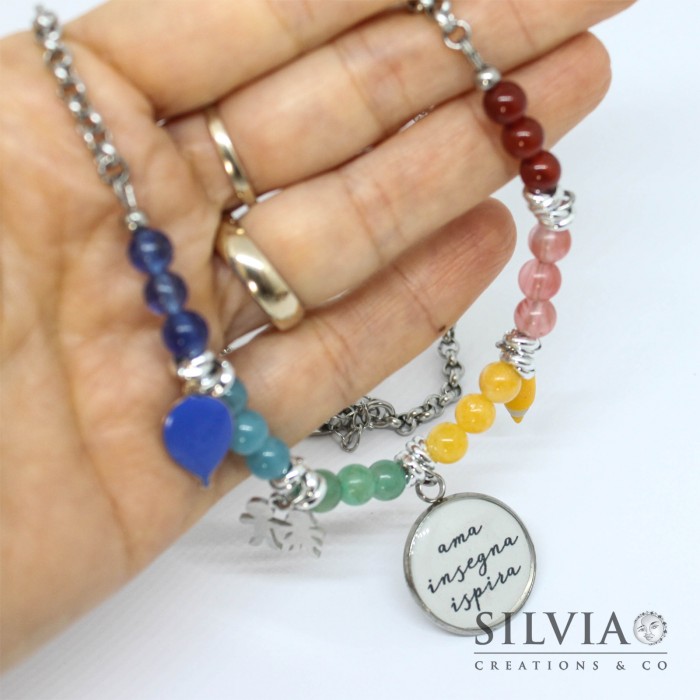 Collana con pietre dure arcobaleno ciondolo Insegna ama ispira e charms