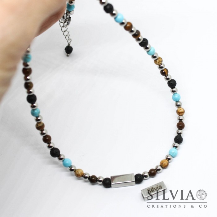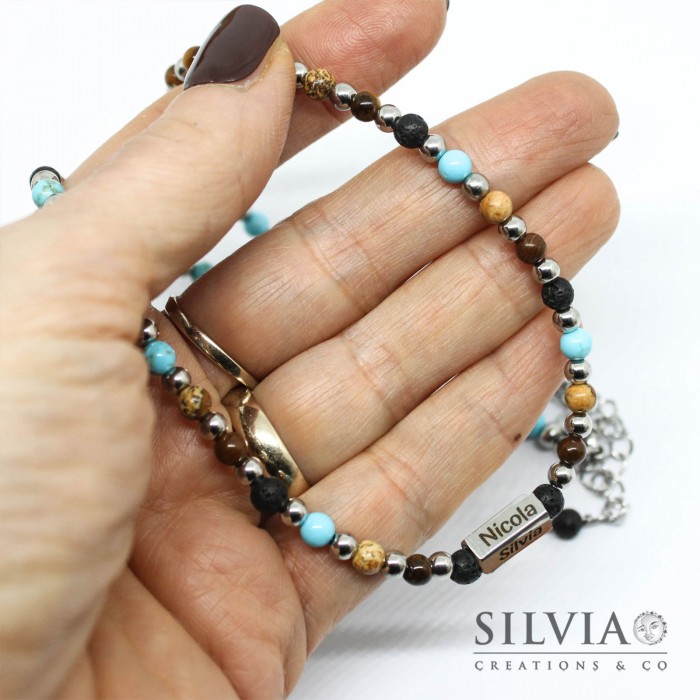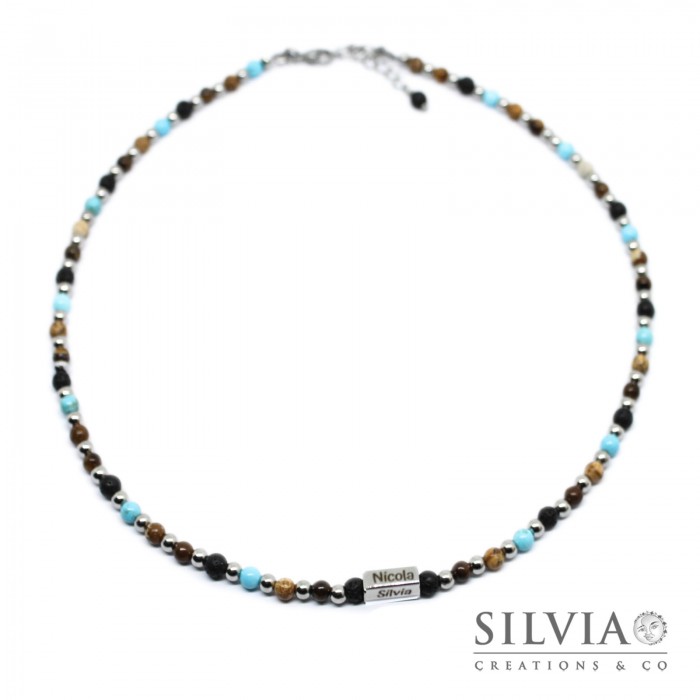 Collana uomo con perle di pietra lavica occhio di tigre diaspro turchese tubetto con incisione