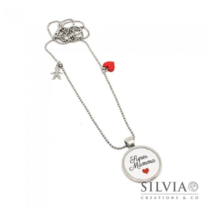 Ho realizzato questa collana come idea regalo per la Festa della mamma. Ho utilizzato una catena a pallini in acciaio a cui ho fissato un ciondolo in zama da 25 mm realizzato con la tecnica della resina colata. All'interno del ciondolo ho inserito un'immagine con la scritta "Super Mamma" ed un cuore rosso.