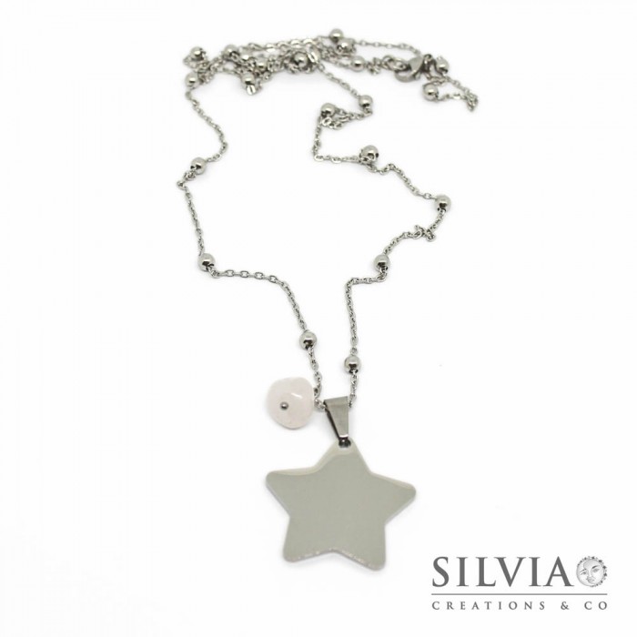 Collana lunga in acciaio con stella e pietra di quarzo rosa