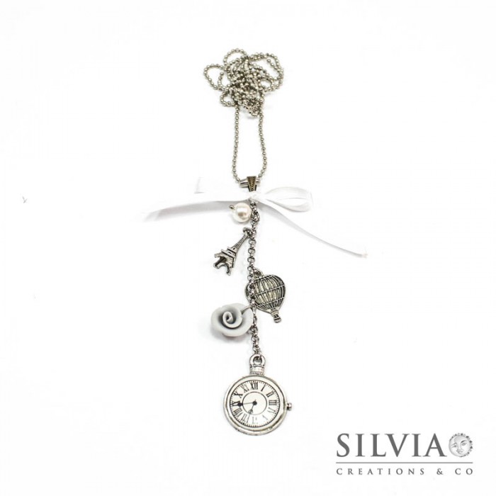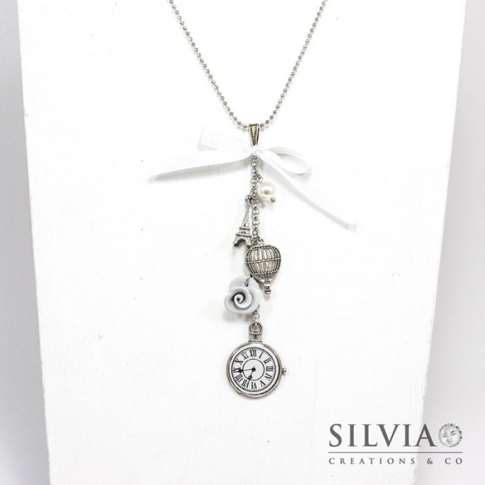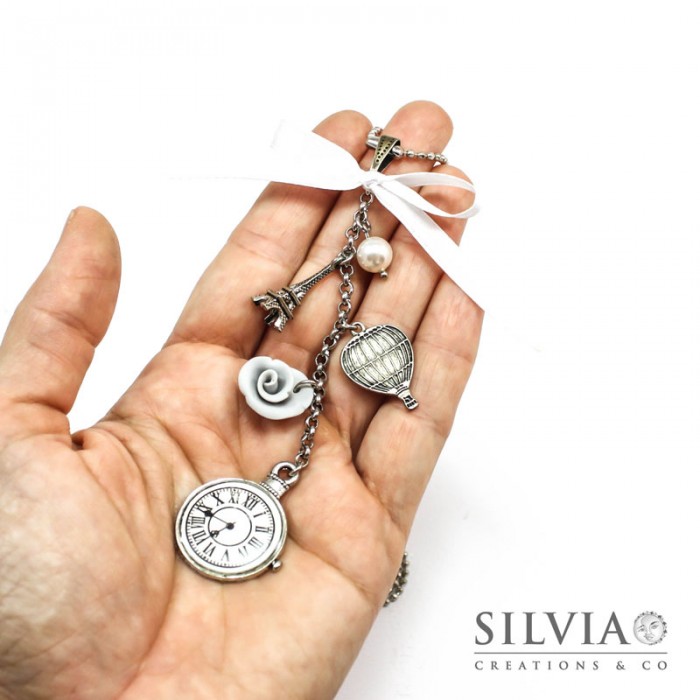 ciondoli in zama color rodio: una mongolfiera, un orologio smaltato e la tour
