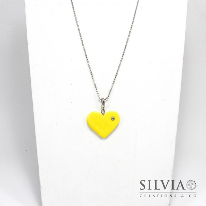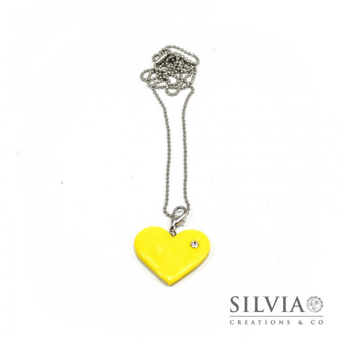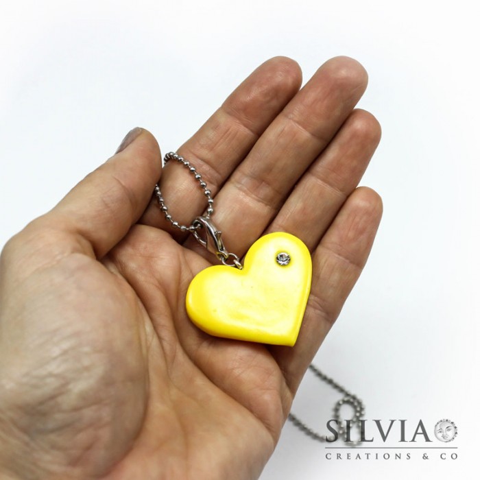 fimo. Il ciondolo è a forma di cuore color giallo, misura circa 40x33 mm e