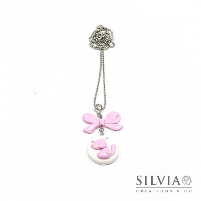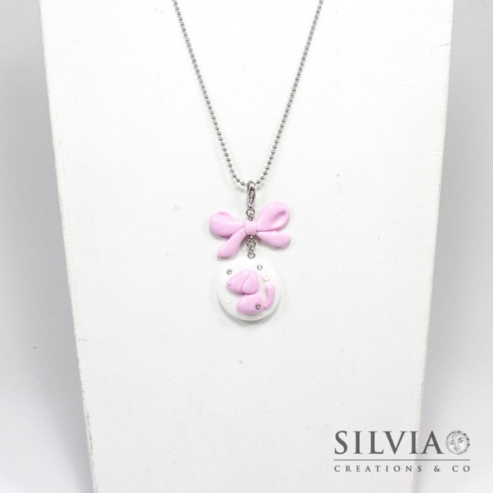 fiocco da 38x25 mm color rosa. L'altro ciondolo è un disco bianco da 30x30 mm a