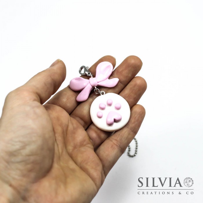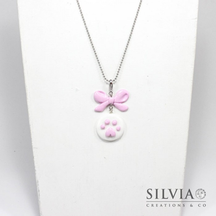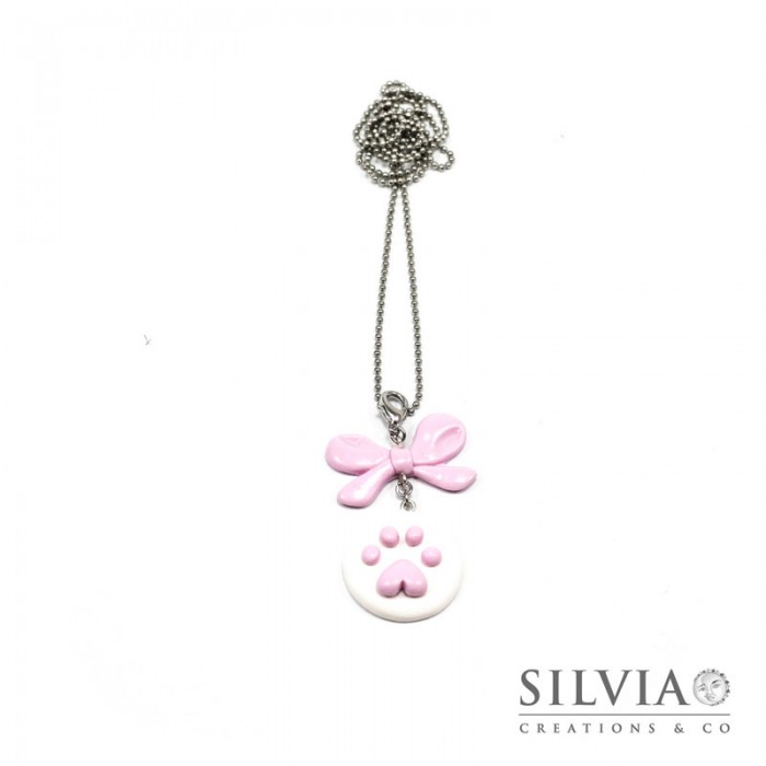 Collana lunga con zampa rosa su disco bianco e fiocco