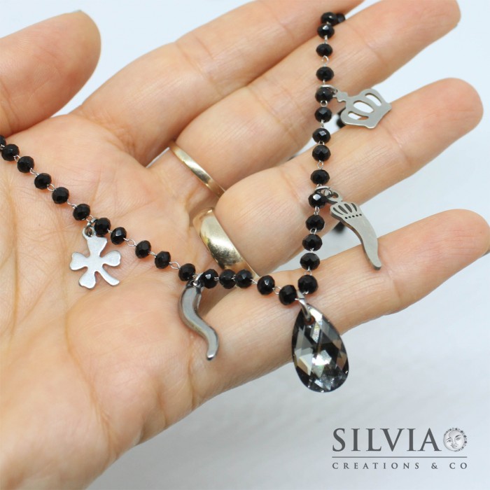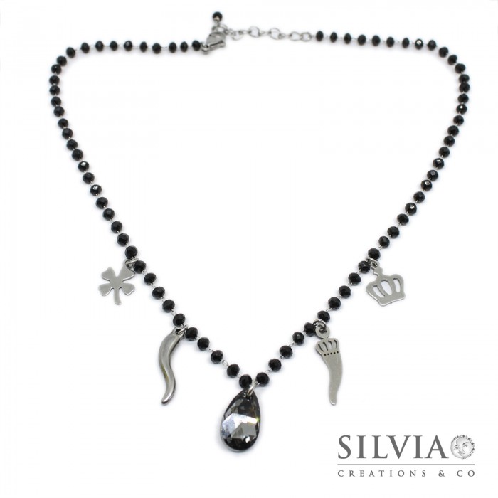 Collana girocollo catena acciaio con cristalli neri e ciondoli portafortuna