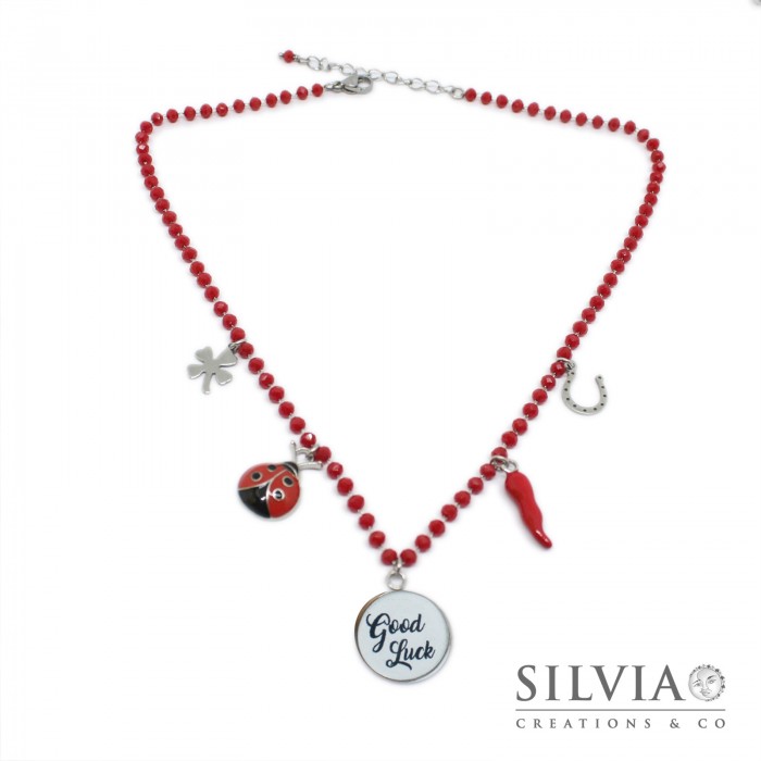 Collana girocollo catena acciaio con cristalli rossi e ciondoli portafortuna