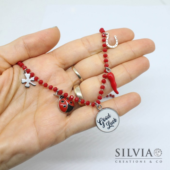 Bracciale catena acciaio con cristalli rossi e ciondoli portafortuna