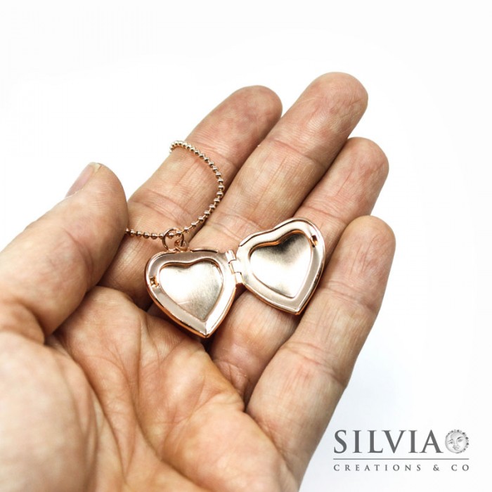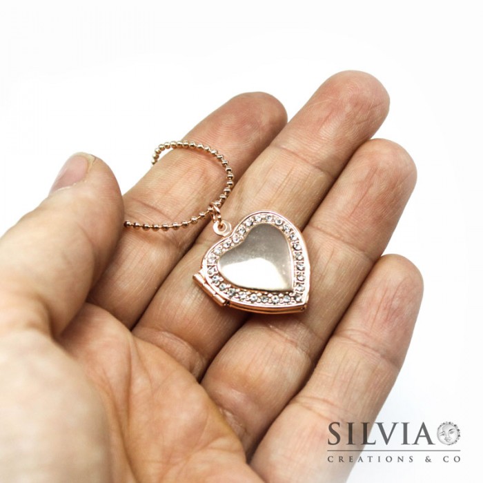 Collana ciondolo portafoto a cuore con strass oro rosato 22 mm
