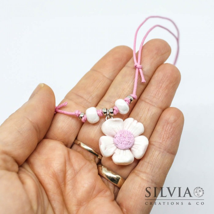 Ho realizzato questa collana con un ciondolo in fimo fatto a mano e del cordino cerato. Il ciondolo misura circa 22 mm ed è a forma di fiore rosa e bianco. Questo è fissato ad un cordino di cotone cerato color rosa, nel quale ho infilato due perline bianche e 4 perline distanziatrici argento in ottone da 4 mm. Facendo scorrere i due nodi è possibile regolare la lunghezza del girocollo da un minimo di 40 cm ad un massimo di 80 cm.