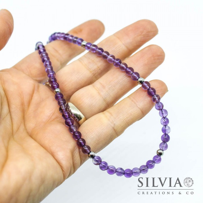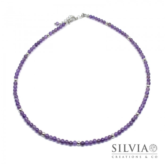 Collana uomo con perle di ametista da 4 mm e perle acciaio