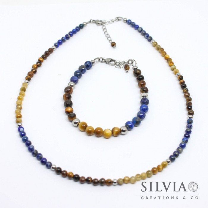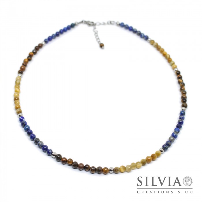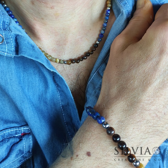 Ho realizzato questa collana da uomo con delle perle in occhio di tigre con sfumature marroni  e gialle e perle di lapislazzuli blu da 4 mm, intervallate da perle in acciaio.