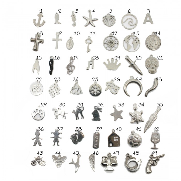 Inoltre dovrete indicare quali ciondoli dovrò aggiungere alla collana tra: 1. ancora, 2. pesce, 3. cavalluccio marino, 4. stella marina, 5. conchiglia, 6. cerchio con onda del mare, 7. lettera iniziale, 8. croce anticata e spessa, 9. croce liscia, 10. medaglietta madonna, 11. chiave, 12. rosa dei venti, 13. mondo, 14. cento lire, 15. mano con corna scaramantiche, 16. cornetto nero, 17. chiave di violino, 18. note musicali semicrome, 19. corona, 20. pugnale, 21. teschio messicano, 22. ohm om aum, 23. nodo infinito tibetano, 24. nodo triquetra, 25. cristallo di ghiaccio, 26. occhio di Ra, 27. mezza luna rovesciata, 28. cornetto acciaio, 29. zampa, 30. cane, 31. gatto, 32. coniglio, 33. stella, 34. tartaruga, 35. piuma, 36. bambino, 37. bambina, 38. piedi, 39. targhettina family, 40. casa, 41. pallone da calcio, 42. bicchiere vino, 43. bicicletta, 44. ape, 45. rondine, 46. ala, 47. bilancia, 48. manette, 49. pistola