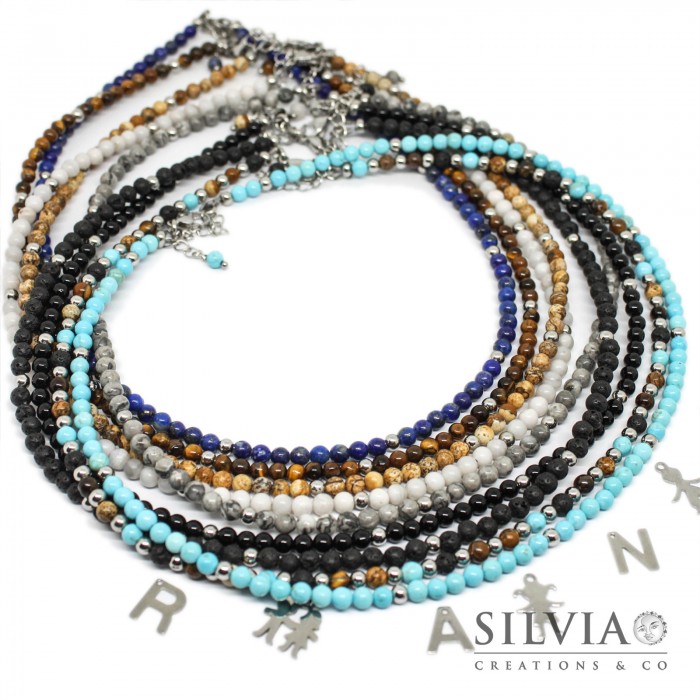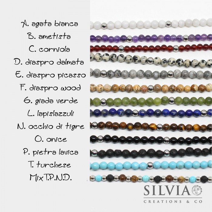 La collana è infilata con perle da 4mm di pietre dure a scelta tra: A. agata bianca, B. ametista, C. corniola, D. diaspro dalmata, E. diaspro picasso, F. diaspro wood, G. giada verde, L. lapislazzuli, N. occhio di tigre, O. onice, P. pietra lavica, T. turchese, Mix T.P.N.F. (turchese pietra lavica occhio di tigre diaspro wood), e sono intervallate da perle di acciaio. La collana ha una lunghezza regolabile grazie ad una catenina allungatrice in acciaio e va da un minimo di 45 cm ad un massimo di 50 cm. Il costo della collana può variare in base al tipo di pietra.