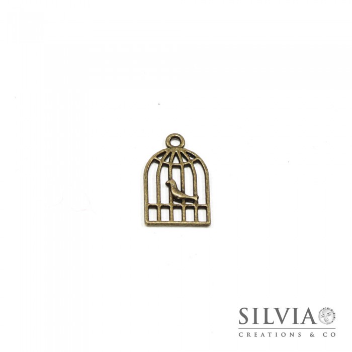 Charm a forma di gabbietta con uccellino bronzo in zama 19x12 mm