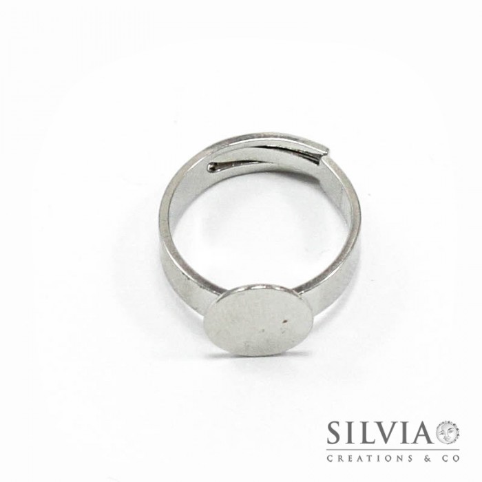 Anello regolabile con base da 10 mm per incollare color rodio in zama. Confezione da 1 pezzo.