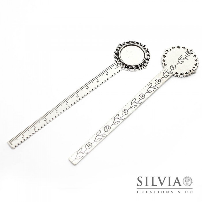 Segnalibro a forma di righello con cammeo argento antico in zama da 133x32 mm con vassoio da 20mm. Il righello misura da 0 a 10 cm. Questa base può essere decorata applicando un cammeo, un’immagine sigillata con la resina o con vetrino, con un cristallo cabochon, oppure può essere decorata con la pasta sintetica (fimo) creando un soggetto con effetto 3d. Anallergico, senza nichel, cadmio e piombo. Confezione da 1 pezzo.