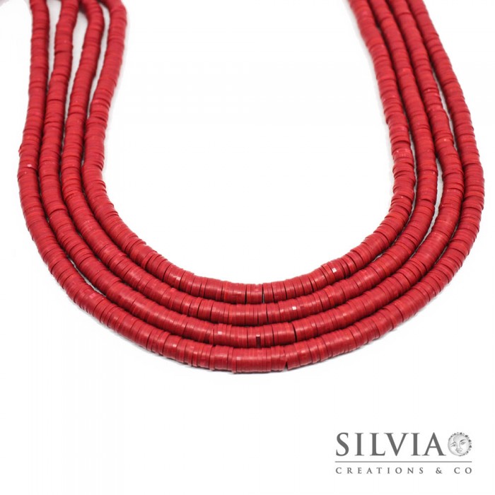 Filo di perle a disco in pasta polimerica color rosso scuro da 6x1 mm. Confezione da 1 filo. Queste rondelle di argilla polimerica vengono chiamate anche heishi, perchè simulano le rondelle di conchiglie con cui i nativi americani realizzavano le loro collane.
