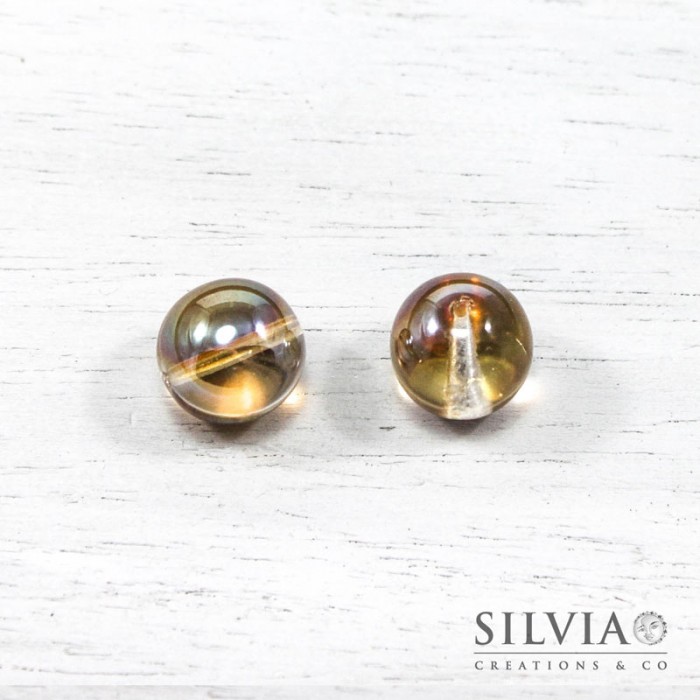 Perla in vetro color topazio chiaro aurora boreale. La perla presenta una forma tonda, misura 14 mm di diametro ed ha uno spessore di 14 mm. Confezione da 1 pezzo.