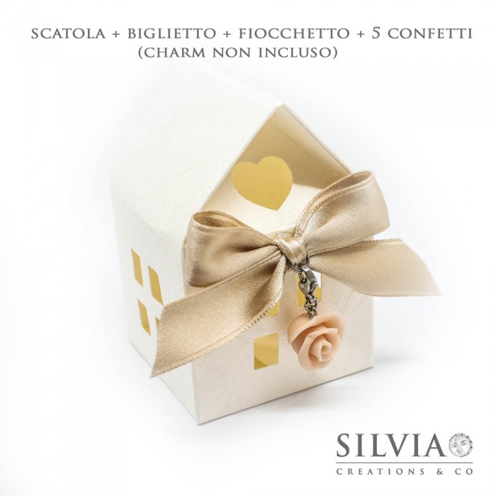 Confezione completa comprensiva di scatola a forma di casetta porta confetti in cartoncino panna effetto matelasse' con finestre, bigliettino con il nome del festeggiato e la data dell'evento, cinque confetti alla mandorla e fiocco di raso alto 15 mm del colore desiderato. Questa scatola è indicata per confezionare le bomboniere per il festeggiamento di matrimoni, anniversari di nozze, battesimi, comunioni, cresime o per confezionare le vostre creazioni.