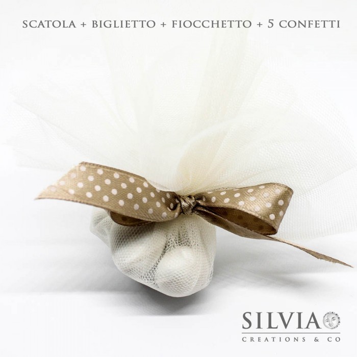 Confezione completa comprensiva di disco di tulle doppio portaconfetti per bomboniera, bigliettino con il nome del festeggiato e la data dell'evento, cinque confetti alla mandorla e fiocco di raso alto 15 mm del colore desiderato. Questa confezione è indicata per le bomboniere per il festeggiamento di matrimoni, anniversari di nozze, battesimi, comunioni, cresime, lauree.