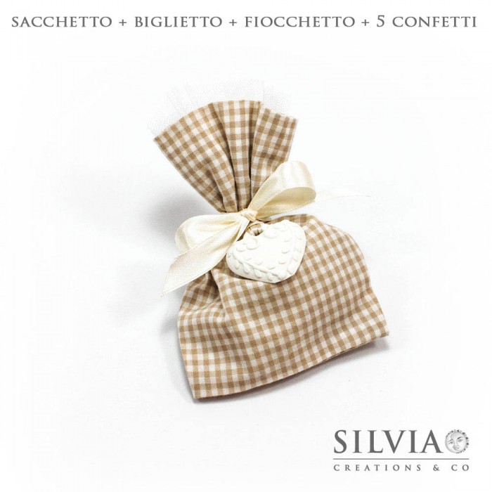 Confezione completa comprensiva di sacchetto in cotone con quadrettino medio beige e bianco portaconfetti per bomboniera da 12x15 cm, due dischi di tulle contenenti i confetti, bigliettino con il nome del festeggiato e la data dell'evento, cinque confetti alla mandorla e fiocco di raso alto 15 mm del colore desiderato. Questa confezione è indicata per le bomboniere per il festeggiamento di matrimoni, anniversari di nozze, battesimi, comunioni, cresime, lauree.