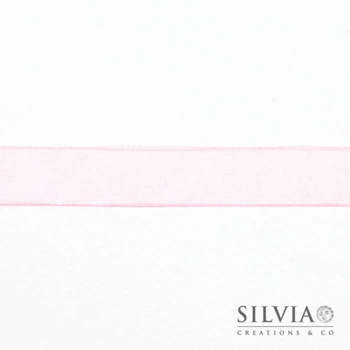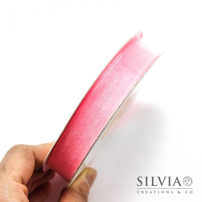 Nastro organza color rosa da 16 mm. Ideale per confezionare bomboniere, decorare pacchi regalo, ecc. Questo prodotto è venduto in rotoli da 50 metri.