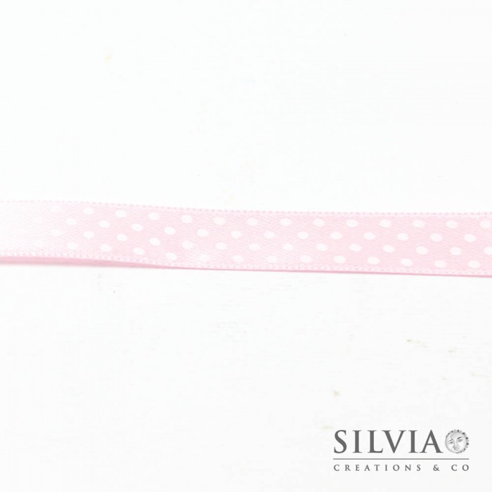 Nastro raso color rosa chiaro a pois da 13 mm. Ideale per confezionare bomboniere, decorare pacchi regalo, ecc. Questo prodotto è venduto su rotolo da 25 metri.