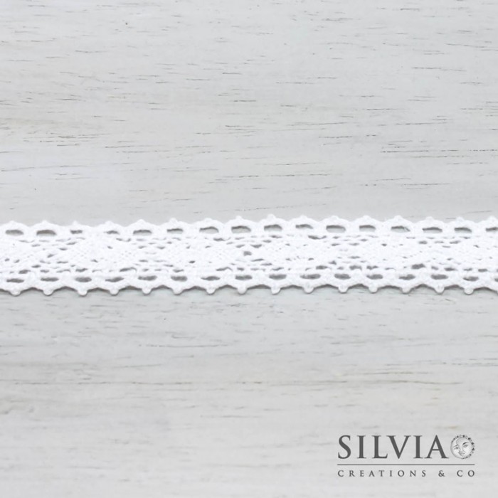 Nastro tombolo color bianco da 15 mm. Ideale per confezionare bomboniere, decorare pacchi regalo, decorare scatole per un perfetto stile shabby chic. Questo prodotto è venduto al taglio, in multipli di 1 metro.