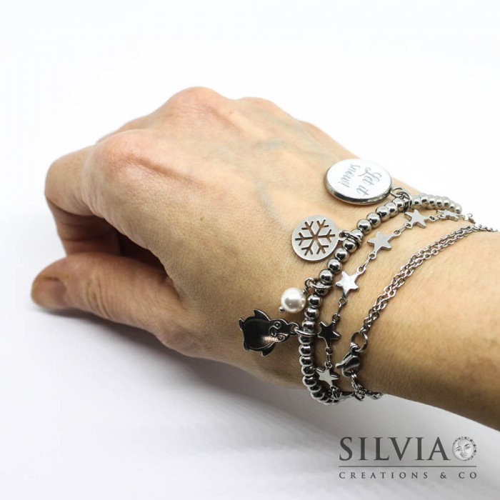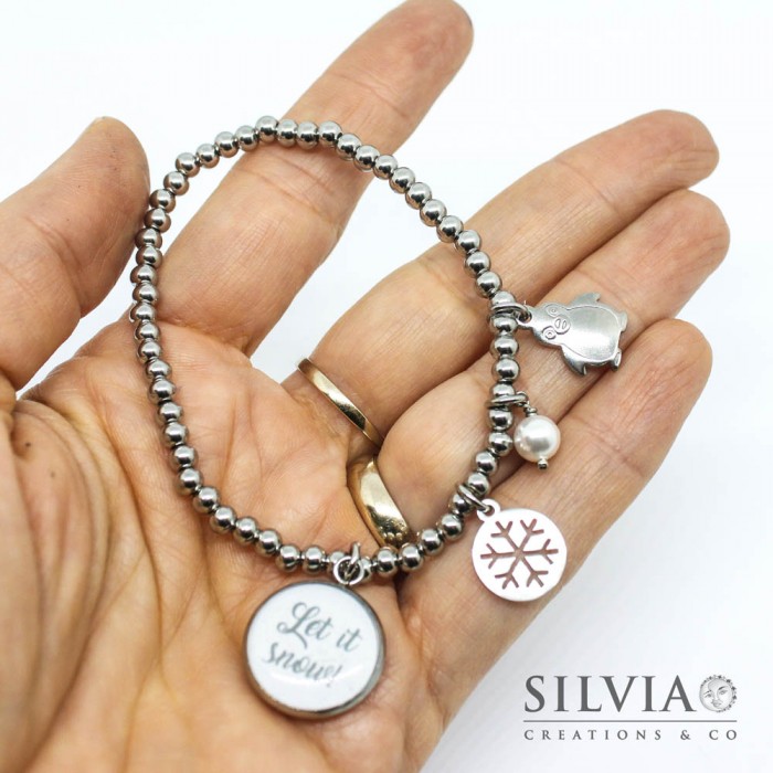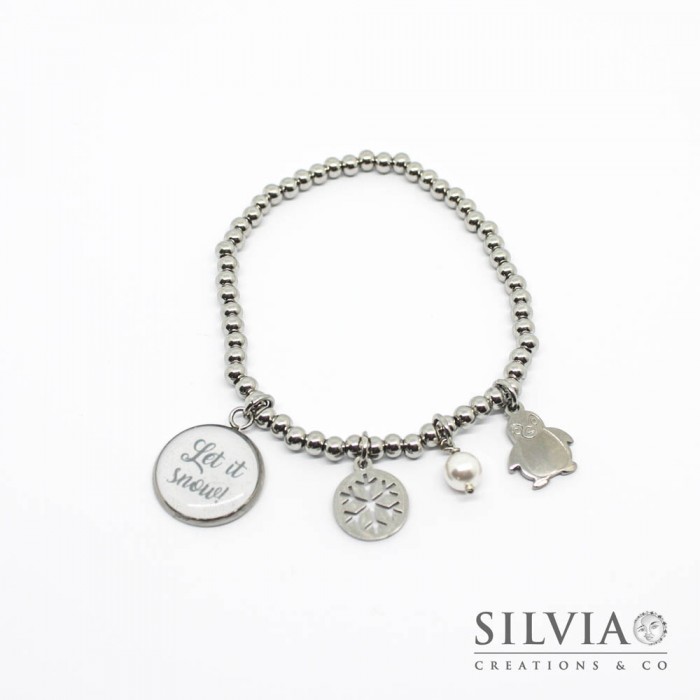 Bracciale elastico con perle acciaio pinguino e fiocco di neve