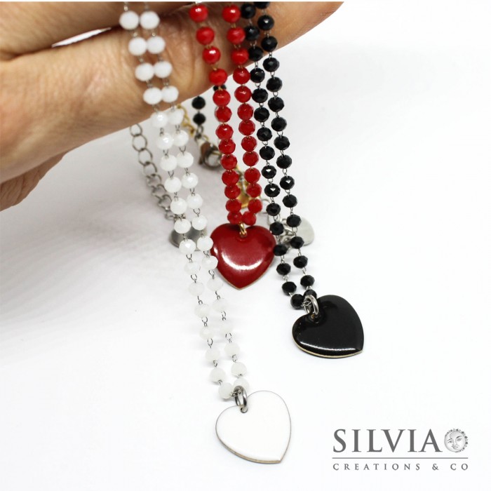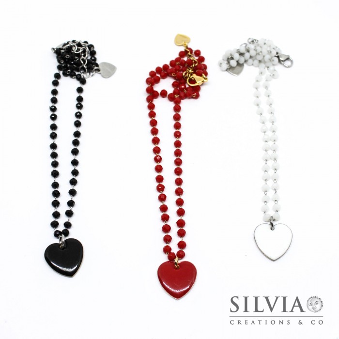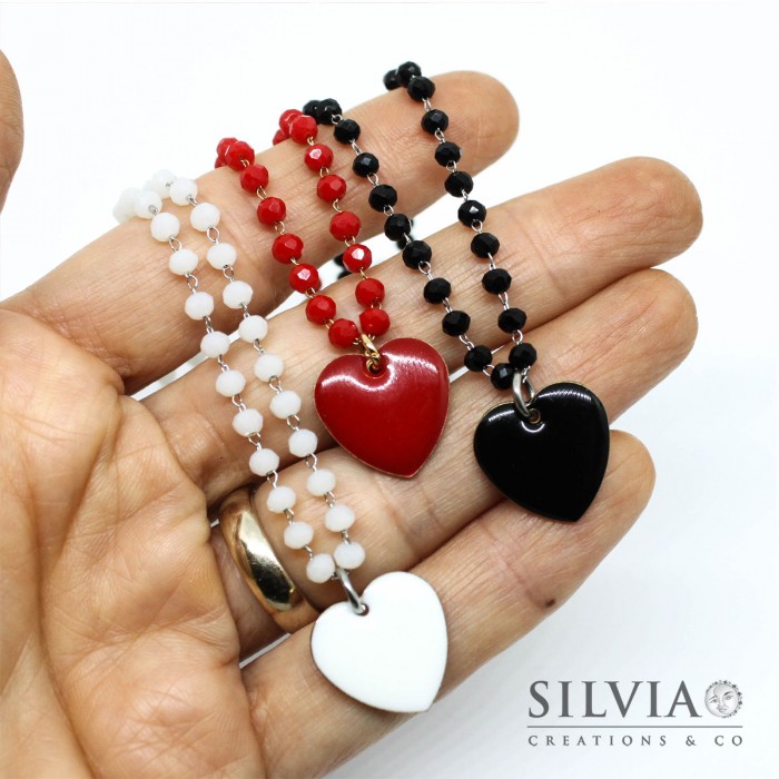 Ho realizzato questa collana con una catena in acciaio con cristalli da 3,5x3 mm bianchi rossi o neri e nella parte centrale ho fissato un cuore. Il ciondolo centrale è un cuore smaltato di bianco rosso o nero a vostra scelta da 16x16mm.