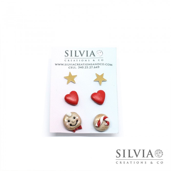 Tris di orecchini a lobo con omino pan di zenzero candy cane cuori rossi e stelle oro