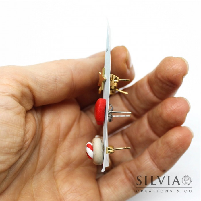 Ho realizzato questo tris di orecchini utilizzando una base in acciaio alla quale ho incollato due ciondoli fatti a mano in pasta sintetica fimo, uno a forma di faccina di Omino pan di zenzero e uno a forma di iscottino con sopra un candy cane (bastoncino di zucchero) grande circa 1 cm. un'altra coppia di orecchini li ho realizzati con due cuori rossi sempre realizzati a mano in pasta sintetica e una terza coppia è fatta da stelline in acciaio dorato. Gli orecchini fatti in pasta sintetica essendo realizzati a mano senza l'ausilio di stampi potrebbero presentare delle lievi differenze rispetto alla fotografia.