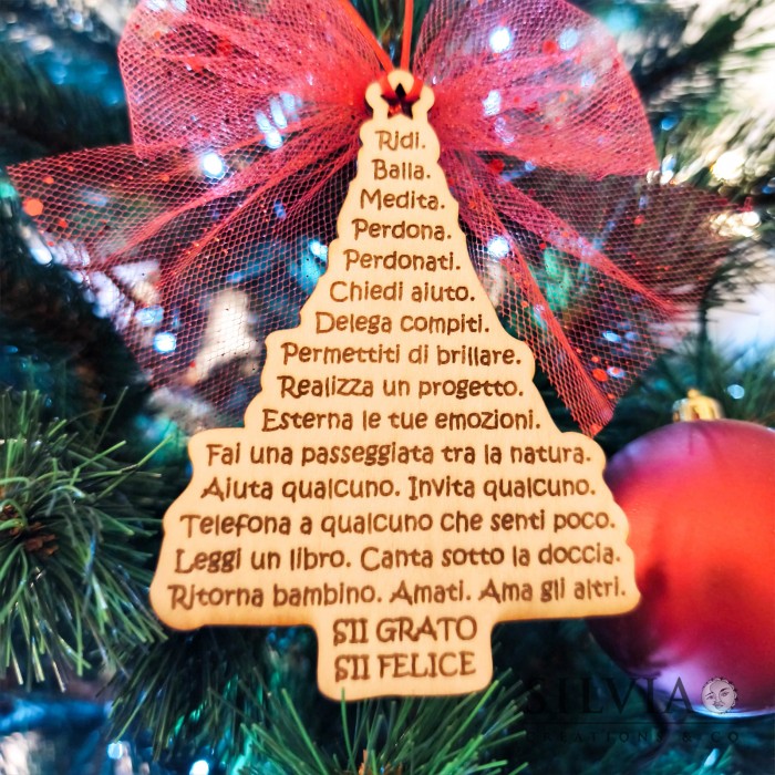 Decorazione natalizia a forma di albero con frase di buon augurio