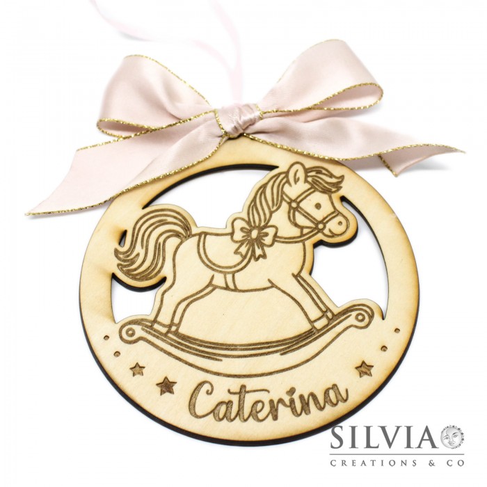 Questa creazione viene realizzata con l'incisore su legno. Si tratta di una pallina tonda con inciso un cavallo a dondolo e sotto il nome.