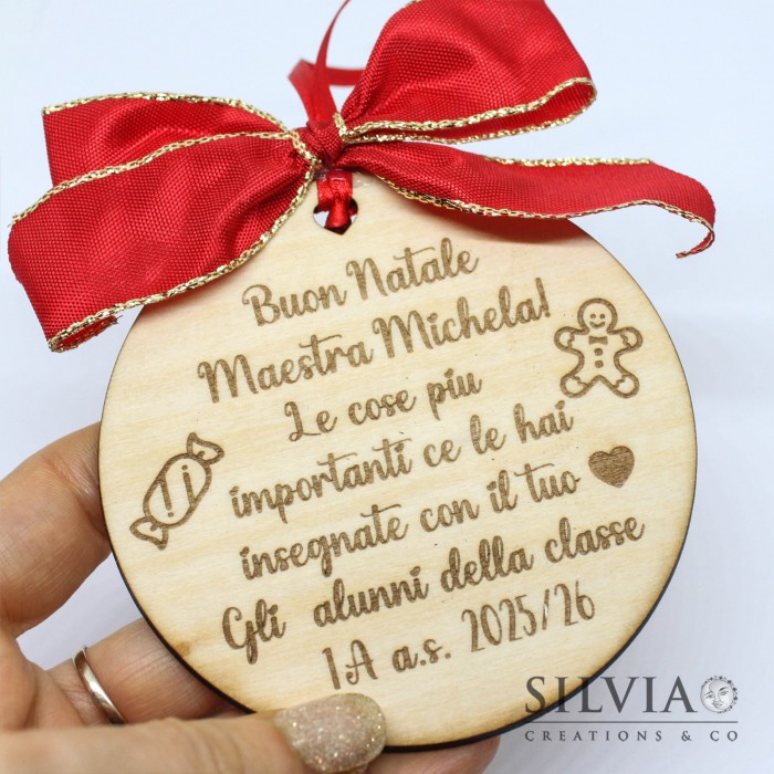 Questa creazione viene realizzata con l'incisore su legno. Si tratta di una pallina tonda con incisa una frase a vostra scelta (es. "I veri addobbi dell'albero di Natale sono i sorrisi delle persone che ci sono intorno" oppure "Buon Natale Maestra Michela! Le cose più importanti ce le hai insegnate con il tuo cuore. Gli alunni della classe 1A a.s. 2025/26")
